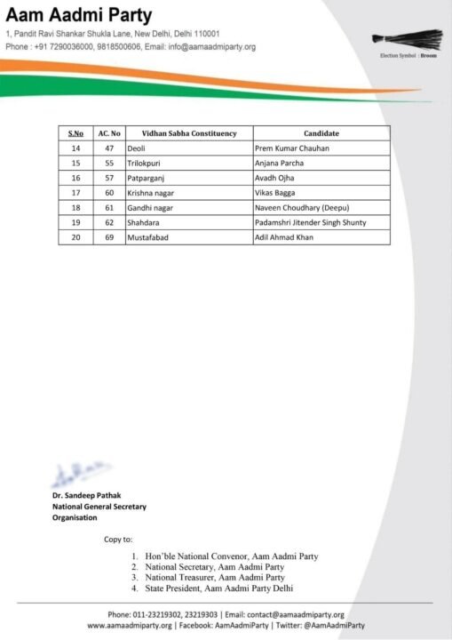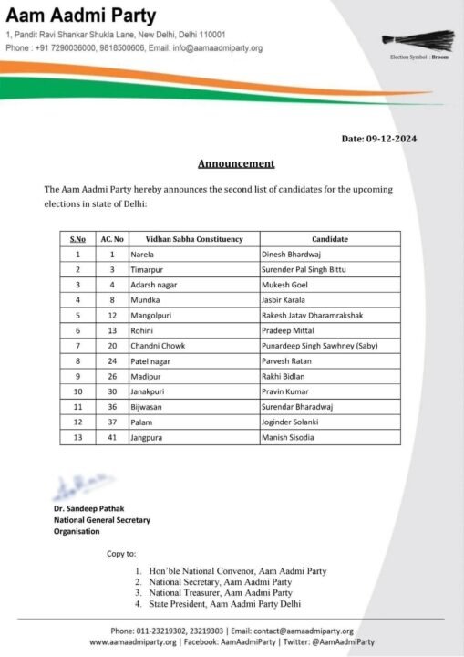 दिल्ली विधानसभा चुनाव के लिए आम आदमी पार्टी (आप) ने उम्मीदवारों की दूसरी सूची जारी कर दी है। आप ने फरवरी में होने वाले इस चुनाव में 20 और उम्मीदवारों को मैदान में उतारा है। मनीष सिसोदिया की सीट बदल दी गई है।