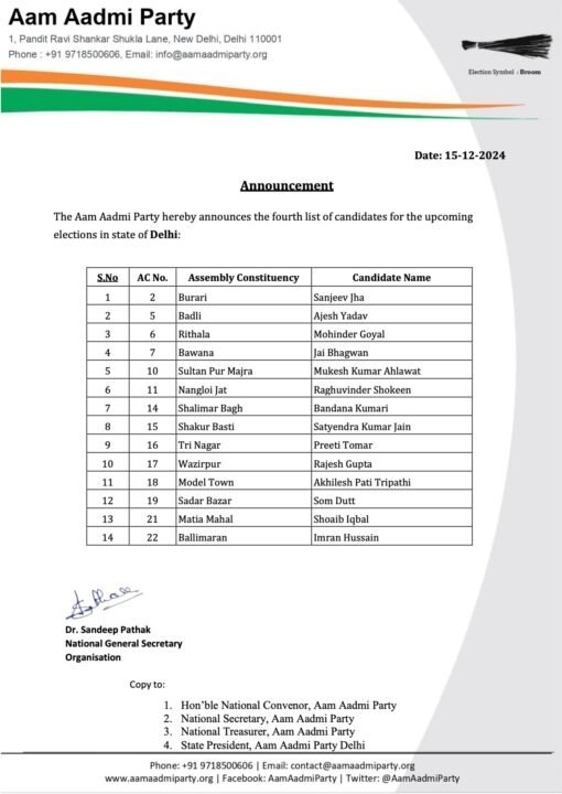 Delhi Vidhansabha Election: आम आदमी पार्टी ने दिल्ली विधानसभा चुनाव 2024 के लिए अपने सभी 70 उम्मीदवारों की सूची जारी कर दी है। रविवार को तीसरी और अंतिम सूची में 38 नामों की घोषणा की गई।