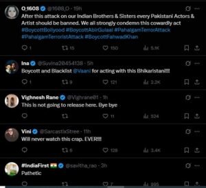 एक यूजर ने लिखा, ‘क्या हम अब भी भारतीय सिनेमा में पाकिस्तानी कलाकारों के पक्ष में हैं? क्या हम अब भी ‘अबीर गुलाल’ जैसी फिल्मों को भारत में बनने और रिलीज होने की अनुमति देने वाले हैं, जिनमें पाकिस्तानी एक्टर्स काम कर रहे हैं?’,