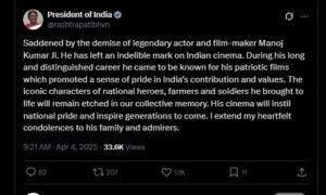 पीएम मोदी ने एक्स पर ट्विट करते हुए दिग्गज अभिनेता मनोज कुमार को श्रद्धांजलि देते हुए लिखा कि- “महान अभिनेता और फ़िल्मकार श्री मनोज कुमार जी के निधन से बहुत दुःख हुआ। वे भारतीय सिनेमा के प्रतीक थे, जिन्हें ख़ास तौर पर उनकी देशभक्ति के जोश के लिए याद किया जाता था, जो उनकी फ़िल्मों में भी झलकता था। मनोज जी के कामों ने राष्ट्रीय गौरव की भावना को जगाया और वे पीढ़ियों को प्रेरित करते रहेंगे। इस दुख की घड़ी में मेरी संवेदनाएँ उनके परिवार और प्रशंसकों के साथ हैं। ओम शांति।”