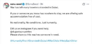 सोनू सूद ने सोशल मीडिया के अपने इंस्टाग्राम के अकाउंट पर एक वीडियो शेयर किया और एक्स पर एक पोस्ट किया जिसमें लिखा कि- ‘युद्ध की वजह से कई यात्री दुबई में फंस गए हैं। अगर आप या आपका कोई जानने वाला वहां है और रहने की जगह नहीं है, तो हम फ्री में सुरक्षित ठहरने की सुविधा दे रहे हैं। कोई शर्त नहीं, कोई राष्ट्रीयता की पाबंदी नहीं। बस इंसानियत के नाते मदद की जा रही है। अगर आपको मदद चाहिए तो इंस्टाग्राम पर @dugastaproperties को मैसेज करें।’