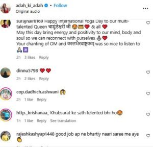 एक यूजर ने लिखा कि -‘Wow she is a talented and amazing actress 🔥🔥🔥’, एक ने लिखा कि- ‘Happy International Yoga Day, Ma’am! 🙏 You looked lovely in your paati’s saree ❤️ Wishing you a day filled with peace and positivity 🌈’, एक ने लिखा कि- ‘Wow this atmosphere of motivation and energy is so amazing ❤️’,