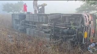 अज्ञात वाहन से टकराकर बस पलटी, 17 लोग घायल