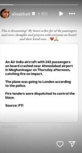 ‘अहमदाबाद में विमान दुर्घटना की खबर सुनकर स्तब्ध हूं। पीड़ितों के परिवारों के साथ-साथ क्रू दल के लिए दुआ कर रही हूं। इस मुश्किल समय में सभी के लिए प्रार्थनाएं ही कर सकते हैं’।