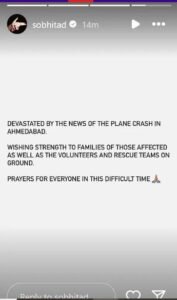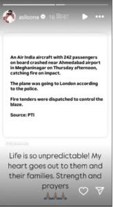 एक्ट्रेस ने प्लेन क्रेश हादसे पर दुख जताते हुए लिखा कि- ‘एयर इंडिया फ्लाइट दुर्घटना की खबर सुनकर बहुत दुख हुआ। विमान में सवार सभी यात्रियों, चालक दल और उनके परिवारों के लिए प्रार्थना कर रही हूं। इस दुख को शब्दों में बयां नहीं किया जा सकता’।