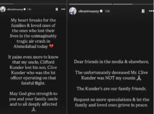Ahmedabad Plane Crash: 12 जून को अहमदाबाद के सरदार वल्लभभाई पटेल अंतरराष्ट्रीय हवाई अड्डे पर एक दुखद हादसा हुआ, जब लंदन जा रही एयर इंडिया की फ्लाइट टेकऑफ के कुछ ही मिनटों बाद दुर्घटनाग्रस्त हो गई। इस हादसे में एक्टर विक्रांत मैसी के एक फैमिली फ्रेंड क्लाइव कुंदर का निधन हो गया। कुंदर फ्लाइट के फर्स्ट ऑफिसर थे, जिसके बाद विक्रांत ने अपने इंस्टाग्राम स्टोरी में एक पोस्ट शेयर कर शोक व्यक्त किया।