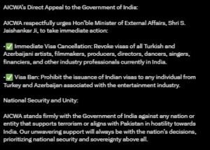 उन्होंने प्रेस नोट में लिखा कि- ‘विदेश मंत्री डॉ. एस जयशंकर को संबोधित करते हुए मांग की है कि तुर्की और अजरबैजान के सभी कलाकारों, फिल्मकारों और फाइनेंसरों के वीजा तत्काल प्रभाव से रद्द किए जाएं। इसके साथ ही भविष्य में भी उन्हें भारत में किसी भी फिल्म परियोजना के लिए वीजा न दिए जाने की अपील की गई है।’
