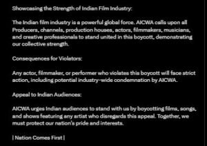 AICWA ने चेतावनी ‘कोई भी अभिनेता, फिल्म निर्माता या कलाकार जो इस बहिष्कार का उल्लंघन करता है, उसे सख्त कार्रवाई का सामना करना पड़ेगा, जिसमें AICWA द्वारा संभावित उद्योग-व्यापी निंदा भी शामिल है।’