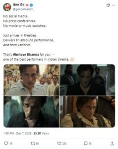 हाल हि में रिलीज हुई फिल्म “धुरंधर” में ‘रहमान डकैत’ का किरदार निभा रहें अक्षय खन्ना ने अपने धमाकेदार डायलॉग और शानदार एक्टिंग से लाखों लोगों का दिल जीता है।