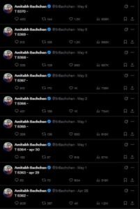 22 अप्रैल के बाद से अमिताभ बच्चन हर दिन माइक्रोब्लॉगिंग प्लेटफॉर्म X (पहले ट्विटर) पर एक ट्वीट कर रहे थे। इन ट्वीट्स में सिर्फ एक नंबर होता था — जैसे 5370, 5371, 5372… न कोई शब्द, न इमोजी, न भाव।