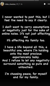 27 मार्च 2026 रामनवमी के शुभ अवसर पर रितिका चौहान ने अपने पहले बच्चे का स्वागत किया और इस खुशखबरी की जानकारी देते हुए स्टोरी में बच्चे के नन्हें पैरों की तस्वीर शेयर करते हुए पोस्ट में लिखा कि- “राम नवमी के पावन दिन भगवान ने हमें हमारे सबसे अनमोल तोहफे से नवाजा है।”