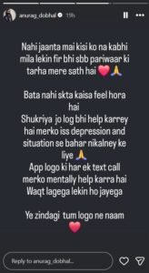 22 मार्च को अनुराग डोभाल ने देर रात सोशल मीडिया के इंस्टाग्राम पर एक वीडियो शेयर किया। उसमें अनुराग ने कहा कि- ‘पिछले कुछ दिनों मैं इतने सारे लोगों को कॉल, टेक्स्ट और वीडियो कॉल्स आए। जिनसे मेरे कभी खून के रिश्ते नहीं थे। उन्होंने मुझे डांट लगाई कि तूने खुद को अनाथ कैसे बोल दिया।’