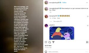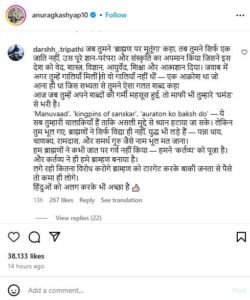अनुराग ने अपने कैप्शन में लिखा कि- ‘मनुवादियाँ और गैर संस्कारी ब्राह्मणो के लिए। माफी’ और एक पोस्ट की जिस पर एक यूजर ने लंबा चौड़ा कमेंट करते हुए लिखा कि- जब तुमने ‘ब्राह्मण पर मूतूंगा’ कहा, तब तुमने सिर्फ एक जाति नहीं, उस पूरे ज्ञान-परंपरा और संस्कृति का अपमान किया जिसने इस देश को वेद, शास्त्र, विज्ञान, आयुर्वेद, शिक्षा और आत्मज्ञान दिया। जवाब में अगर तुम्हें गालियाँ मिलीं तो वो गालियाँ नहीं थीं — एक आक्रोश था जो आना ही था जिस सभ्यता से तुमने ऐसा गलत शब्द कहा आज जब तुम्हें अपने शब्दों की गर्मी महसूस हुई, तो माफी भी तुम्हारे ‘घमंड’ से भरी है।