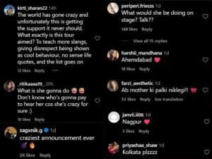इस पोस्ट के बाद सोशल मीडिया पर प्रतिक्रियाओं की बाढ़ आ गई। जहां कुछ फैंस ने उत्साहित होकर पूछा कि वह उनके शहर में कब आएंगी, वहीं अधिकतर यूजर्स ने उन्हें ट्रोल करना शुरू कर दिया। एक यूजर ने लिखा – “ये स्टेज पर करेगी क्या? सिर्फ बातें?” दूसरे ने तंज कसा – “मुझे समझ नहीं आ रहा कि ये क्यों आ रही है।” किसी और ने कमेंट किया – “क्या ये हमें अनादर करना सिखाएगी?” वहीं एक यूजर ने गुस्से में लिखा – “दुनिया क्रेजी हो गई है। इस तरह की चीज को सपोर्ट नहीं मिलना चाहिए” और यूजर ने लिखा, “लोगों को लाल झंडा कैसे बनना है, यह सिखाने के लिए टूर।”