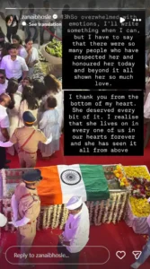 जनाई भोसले ने अपनी दादी के अंतिम संस्कार में मिले सम्मान को देखकर इमोशनल हो गई उन्होंने स्टोरी में तिरंगे में लिपटी आशा भोसले के पार्थिव शव की तस्वीर शेयर करते हुए लिखा कि- ‘मैं अभी इमोशन्स से ओवरवेल्म्ड हूं… जब संभव होगा, तब कुछ लिखूंगी। लेकिन इतना जरूर कहना चाहती हूं कि आज और उससे आगे भी बहुत से लोगों ने उनका सम्मान किया और उन्हें इतना प्यार दिया। मैं दिल की गहराइयों से आप सभी का धन्यवाद करती हूं।’