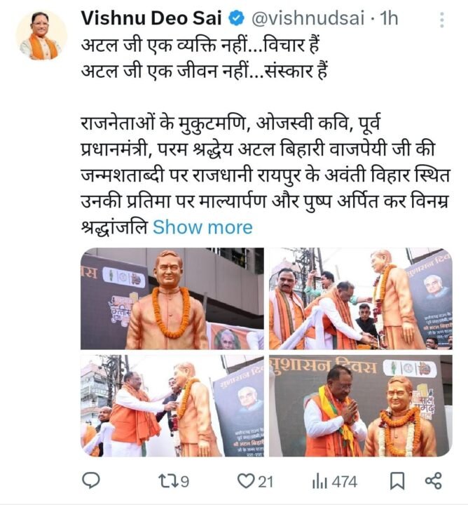 सीएम ने एक्स पर पोस्ट कर अटल बिहारी वाजपेयी को किया याद: