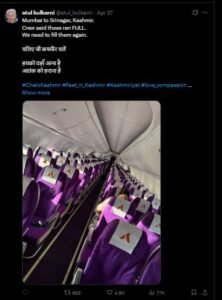 उन्होंने जो तस्वीर शेयर की जिसमें देख सकते है, कि पूरी फ्लाइट लगभग खाली है, इससे साफ समझ आ रहा है कि इस हमले से टूरिज्म पर कितना असर पड़ा है, अतुल ने फ्लाइट की तस्वीर शेयर कर लिखा कि- मुंबई से श्रीनगर, कश्मीर। क्रू ने कहा कि ये भरी रहती थीं। हमें इन्हें दोबारा भरना है। चलिए जी कश्मीर चलें। हमको यहां आना है, आतंक को हराना है।