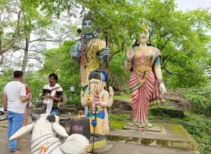 मंदिर के चारों ओर हरे-भरे पेड़ और झरने हैं। खासकर बारिश के दिनों में यह स्थल अत्यंत मनोहारी दृश्य प्रस्तुत करता है।