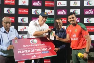 तंजिद हसन 29 रन बनाकर 10वें ओवर में आउट हुए। इसके बाद कप्तान लिट्टन दास ने शानदार फिफ्टी पूरी की। उन्होंने केवल 29 गेंदों पर 54 रन बनाए और नाबाद रहे। उनके साथ सैफ हसन 36 रन बनाकर नॉटआउट रहे। दोनों ने टीम को 14वें ओवर में ही जीत दिला दी। नीदरलैंड की ओर से टिम प्रिंगल और आर्यन दत्त को 1-1 विकेट मिला।