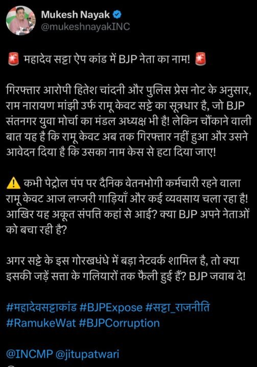 Bhopal crime branch news: इस मामले में कांग्रेस मीडिया प्रभारी मुकेश नायक ने रामू केवट को महादेव सट्टा ऐप से जुड़ा होने का आरोप लगाया है। कांग्रेस का कहना है कि रामू केवट कभी पेट्रोल पंप पर दैनिक वेतन भोगी कर्मचारी था, लेकिन अब लग्जरी गाड़ियों और कई व्यवसायों का मालिक बन चुका है। कांग्रेस ने सवाल उठाया कि रामू केवट के पास इतनी संपत्ति कहां से आई और क्या यह पैसा सट्टे के गोरखधंधे से आया है? इसके अलावा, कांग्रेस ने यह भी सवाल उठाया कि क्या बीजेपी अपने नेताओं को इस मामले में बचा रही है?