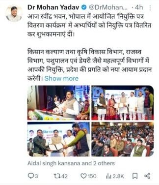 Bhopal News: मुख्यमंत्री डॉ. मोहन यादव ने राजधानी भोपाल के रविंद्र भवन में आयोजित एक कार्यक्रम में तीन विभागों के 362 शासकीय अधिकारियों और कर्मचारियों को नियुक्ति पत्र प्रदान किए। इस अवसर पर 256 कृषि विस्तार अधिकारी, 70 सहायक पशु चिकित्सक और 36 नायब तहसीलदार नियुक्त किए गए।