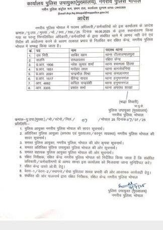 मध्यप्रदेश की राजधानी भोपाल में पुलिस विभाग से जुड़ी एक बड़ी अनुशासनात्मक कार्रवाई सामने आई है। यहां 8 पुलिसकर्मियों को सस्पेंड कर दिया गया है क्योंकि वे ट्रांसफर के बावजूद नई जगह पर रिपोर्ट करने नहीं पहुंचे थे। पुलिस विभाग ने इसे गंभीर लापरवाही मानते हुए तत्काल निलंबन की कार्रवाई की है