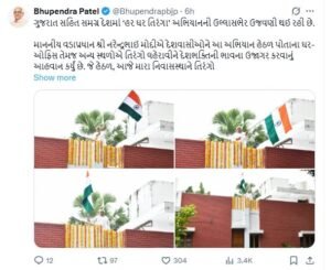 सीएम पटेल ने सोशल मीडिया प्लेटफॉर्म ‘एक्स’ पर पोस्ट कर सभी नागरिकों से अनुरोध किया कि वे भी इस अभियान में भाग लें और अपने घरों पर तिरंगा फहराकर देशभक्ति का प्रदर्शन करें।