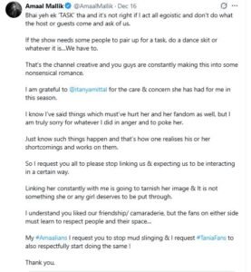 अमाल मलिक ने एक्स पर एक पोस्ट की उसमें उनके और तान्या के रिश्ते पर सफाई दी साथ ही तान्या की तारीफ करते हुए माफी मांगी उन्होंने लिखा कि- ‘मैं इस सीजन में मेरे प्रति दिखाई गई देखभाल और चिंता के लिए @itanyamittal का आभारी हूं।