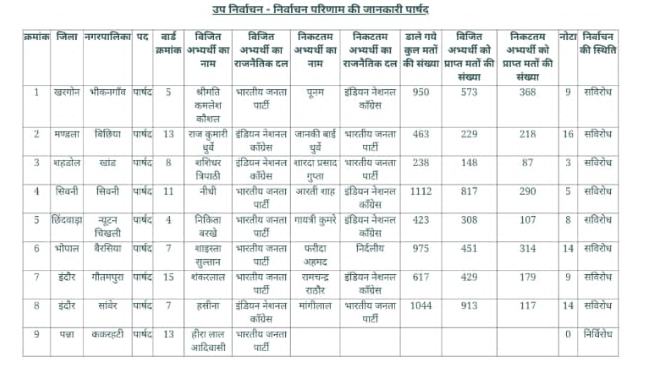 Madhya Pradesh bypoll results: राजधानी भोपाल सहित प्रदेश के कुल 8 जिलों में हुए नगर निकाय उपचुनावों के परिणाम घोषित कर दिए गए हैं। इन उपचुनावों में कुल 9 पार्षद सीटों के लिए मतदान हुआ था। जिन जिलों में चुनाव हुए उनमें भोपाल, इंदौर, छिंदवाड़ा, पन्ना, खरगोन, मंडला, सिवनी और शहडोल शामिल हैं।