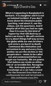 ‘गाजा या फिलिस्तीन में कुछ होने पर हर कोई आगे आता है। लेकिन जब बांग्लादेश में किसी हिंदू की हत्या होती है, तो यह बहुत दुख की बात है कि कोई आगे नहीं आता। समय अपना जवाब देगा।’
