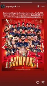बॉलीवुड अभिनेता अजय देवगन ने अपनी इंस्टाग्राम स्टोरी पर RCB की जीत का जश्न मनाते हुए लिखा-