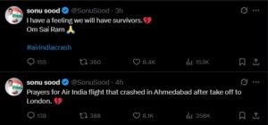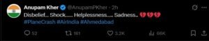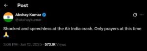 “एयर इंडिया दुर्घटना से स्तब्ध और अवाक हूं। इस समय केवल प्रार्थनाएं ही हैं 🙏”