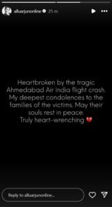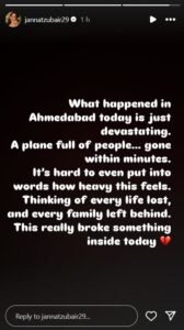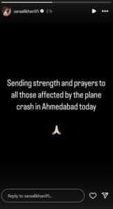 ‘अहमदाबाद में प्लेन के क्रैश होने की खबर सुनकर मेरा दिल टूट गया है और मैं शॉक में हूं। मेरा दिल सभी यात्रियों के लिए, उनके परिवारों और इस क्रैश से प्रभावित हुए सभी लोगों के लिए दुख रहा है। इस मुश्किल वक्त में मैं सभी को अपने ख्यालों और दुआओं में रखे हुए हूं।’