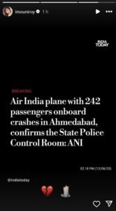“लंदन के लिए उड़ान भरने के बाद अहमदाबाद में दुर्घटनाग्रस्त हुए एयर इंडिया के विमान के लिए प्रार्थना। 💔,मुझे लगता है कि हमारे पास जीवित लोग होंगे।💔