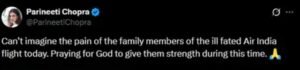 “आज एयर इंडिया विमान दुर्घटना में मारे गए लोगों के परिजनों के दर्द की कल्पना नहीं की जा सकती। ईश्वर से प्रार्थना है कि उन्हें इस दुख की घड़ी में शक्ति प्रदान करें। 🙏”
