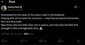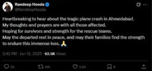 “दिल दहला देने वाली! एयरइंडिया विमान दुर्घटना में किसी के जीवित न बचने की खबर आने के बाद, मैं उस दर्द की कल्पना भी नहीं कर सकता जो परिवारों को सहना पड़ रहा होगा। और उन निर्दोष लोगों के लिए जो जमीन पर थे, जिन्होंने इस त्रासदी की उम्मीद ही नही की थी। प्रार्थनाएं।