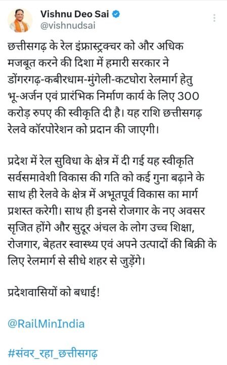 CG News: बैठक में चर्चा के बाद छत्तीसगढ़ रेलवे कॉरपोरेशन को डोंगरगढ़-कबीरधाम-मुंगेली-कटघोरा रेलमार्ग हेतु भू-अर्जन एवं प्रारंभिक निर्माण कार्य के लिए 300 करोड़ रुपए की राशि दिए जाने की स्वीकृति प्रदान की गई। संचालनालय भौमिकी एवं खनिकर्म के खनिज अन्वेषण, खनिज ब्लॉक नीलामी, खानों के आईटी आधारित नियमन हेतु 83 करोड़ रुपए राशि की स्वीकृति प्रदान की गई। इसके साथ साथ बैठक में राज्य में खनिज राजस्व में और वृद्धि की संभावनाओं के अध्ययन कार्यवाही तथा खनन क्षेत्र में सुधार हेतु विशेषज्ञ संस्थाओं की सेवाएं लेने हेतु 20 करोड़ रुपए के अतिरिक्त राशि दिए जाने का निर्णय लिया गया गौरतलब है कि खनिज विभाग द्वारा प्रतिवर्ष प्राप्त होने वाले कुल खनिज राजस्व की 5% राशि खनिज विकास निधि मद अंतर्गत आरक्षित रहती है।