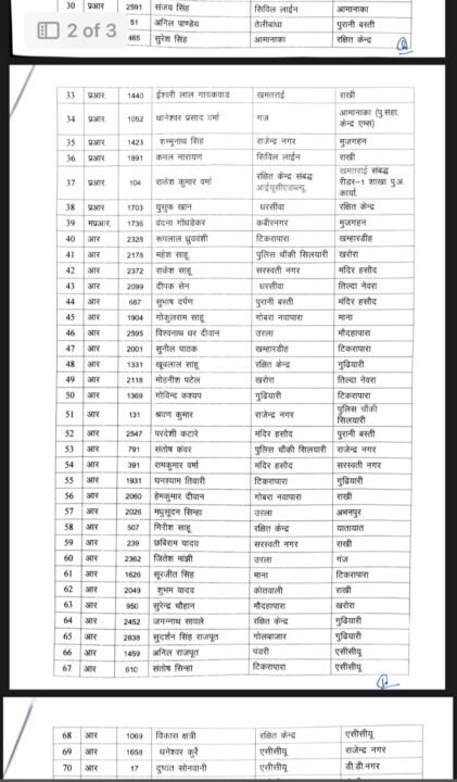 CG News:पुलिस विभाग में बड़े पैमाने पर तबादला हुआ है. शहर और ग्रामीण क्षेत्र के कुल 17 निरीक्षकों का ट्रांसफर किया गया है. तबादला आदेश रायपुर एसएसपी डॉ. लाल उमेंद सिंह ने जारी किया है. लंबे समय के बाद इतनी बड़ी संख्या में राजधानी में थाना प्रभारियों का तबादला हुआ है.