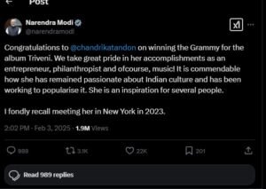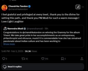 पीएम मोदी ने X पर पोस्ट कर चंद्रिका टंडन को बधाई देते हुए कहा, “त्रिवेणी एल्बम के लिए ग्रैमी पुरस्कार जीतने पर चंद्रिका टंडन को बधाई. हम एक उद्यमी, परोपकारी और निस्संदेह, संगीत के रूप में उनकी उपलब्धियों पर बहुत गर्व करते हैं! यह सराहनीय है कि वह किस तरह भारतीय संस्कृति के प्रति जुनूनी बनी हुई हैं और इसे लोकप्रिय बनाने के लिए काम कर रही हैं. वह कई लोगों के लिए प्रेरणा हैं. मुझे 2023 में न्यूयॉर्क में उनसे हुई मुलाकात अच्छी तरह याद है.”