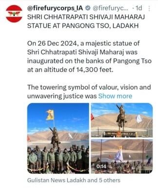 भारतीय सेना ने चीन-भारत सीमा के नजदीक पूर्वी लद्दाख में पैंगोंग झील के किनारे 14 हजार 300 फीट की ऊंचाई पर महान मराठा योद्धा छत्रपति शिवाजी महाराज की एक भव्य मूर्ति स्थापित की है। आपको बता दें कि यह मूर्ति चीन से सीमा पर जारी तनाव के बीच भारतीय सेना के साहस का प्रतीक बनकर उभरेगी। भारतीय सेना का कहना है कि यह मूर्ति छत्रपति शिवाजी के अडिग साहस और वीरता को समर्पित की गई है जो भारतीय सैन्य और सांस्कृतिक धरोहर का प्रेरणास्त्रोत है।