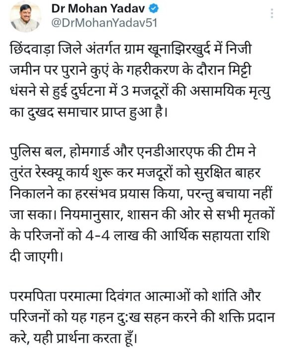Chhindwara Kuan Hadsa: मुख्यमंत्री डॉ. मोहन यादव ने इस घटना पर गहरा दुख व्यक्त किया और मृतकों के परिवारों को 4-4 लाख रुपए की आर्थिक सहायता देने की घोषणा की। सीएम ने अपने सोशल मीडिया अकाउंट पर लिखा कि पुलिस, होमगार्ड और एनडीआरएफ की टीम ने पूरी कोशिश की लेकिन यह घटना दुखद रही।