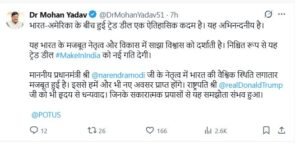 सीएम डॉ. मोहन ने एक्स पर ट्वीट करते हुए लिखा कि- “भारत-अमेरिका के बीच हुई ट्रेड डील एक ऐतिहासिक कदम है। यह अभिनन्दनीय है।