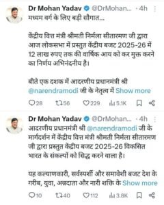 CM Dr. Mohan Yadav budget statement: इसके अलावा, एमपी के मुखिया ने 12 लाख तक की आय को कर मुक्त करने के निर्णय पर केंद्रीय वित्त मंत्री का आभार व्यक्त किया। उन्होंने कहा कि मध्यम वर्ग के लिए यह निर्णय बेहद महत्वपूर्ण है। यह उन्हें सशक्त बनाएगा और उनके सपनों को उड़ान देगा।
