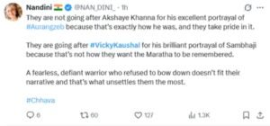 वहीं दूसरी तरफ एक्टर को सपोर्ट करते हुए कुछ यूजर्स ने दिया मुहतोड़ जबाव देते हुए ट्वीट कर एक ने लिखा कि- ‘औरंगजेब के दमदार रोल के लिए वे अक्षय खन्ना के पीछे नहीं जाएंगे क्योंकि वह बिल्कुल वैसे ही थे। और उन्हें इस पर गर्व है। वे संभाजी का शानदार चित्रण करने के लिए विक्की कौशल पर निशाना साध रहे हैं, क्योंकि वे नहीं चाहते कि मराठा को इस तरह याद किया जाए। एक निडर, विद्रोही योद्धा जो झुकने से इनकार कर देता है, उनकी कहानी में फिट नहीं बैठता और यही बात उन्हें सबसे ज्यादा परेशान करती है।’