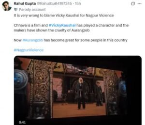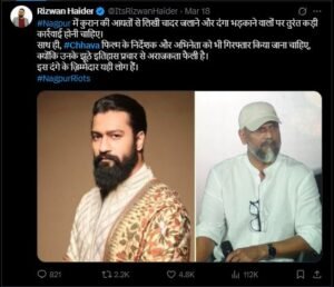 रिजवान हैदर नाम के एक यूजर ने छावा फिल्म के हिरो विक्की कौशल और फिल्म के डायरेक्टर की गिरफ्तारी की मांग करते हुए लिखा कि- नागपुर में कुरान की आयतों से लिखी चादर जलाने और दंगा भड़काने वालों पर तुरंत कड़ी कार्रवाई होनी चाहिए।