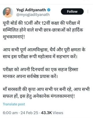 सोशल मीडिया प्लेटफॉर्म ‘एक्स’ पर पोस्ट करते हुए उन्होंने कहा, ‘‘उप्र बोर्ड की कक्षा 10वीं और 12वीं की परीक्षा में सम्मिलित होने वाले सभी छात्रों को मेरी हार्दिक शुभकामनाएं।’’ साथ ही, उन्होंने छात्रों से यह भी कहा, ‘‘पूर्ण आत्मविश्वास, धैर्य और पूरी क्षमता के साथ इस परीक्षा को महोत्सव की तरह मनाएं।’’