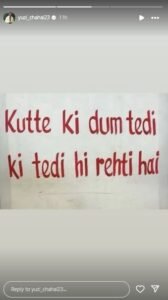भारतीय टीम के फेमस खिलाड़ी चहल ने अपने इंस्टाग्राम पर सैनिको को धन्यवाद किया और पकिस्तान की आलोचना करते हुए लिखा कि- ‘कुत्ते की दुम कभी भी सीधी नही हो सकती वो टेढ़ी की टेढ़ी ही रहती है’।