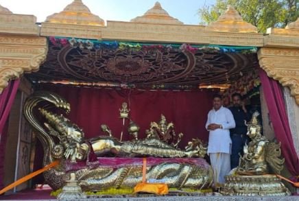 भगवान विष्णु की प्रतिमा 11 फीट लंबी है। पंचधातु से इसे तैयार किया है। जिसका वजन 21 टन है। पंच धातु की यह प्रतिमा मध्यप्रदेश और राजस्थान में तैयार हुई है। हमारे शास्त्रों में कहा गया है कि मिट्टी की प्रतिमा का पूजा का एक गुना फल मिलता है। कांस्य की प्रतिमा की पूजा का दस गुना फल प्राप्त होता है। पाषाण की प्रतिमा का सौ गुना फल मिलता है, लेकिन धातु की जो प्रतिमा होती है उसकी पूजा का अनंत गुना फल मिलता है।