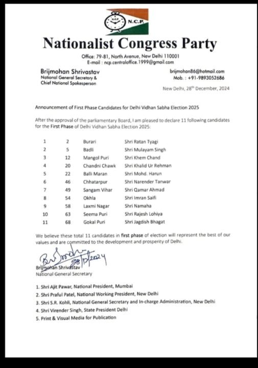 Delhi Election: NCP की पहली सूची में बुराड़ी से रतन त्यागी, चांदनी चौक से खालिद उर रहमान, बल्लीमारन से मोहम्मद हारुन और ओखला से इमरान सैफी को भी मैदान में उतारा गया है। इसके अलावा, गोकुलपुरी से जगदीश भगत, मंगोलपुरी से खेम चंद, लक्ष्मी नगर से नमहा, सीमापुरी से राजेश लोहिया, छतरपुर से नरेंद्र तंवर और संगम विहार से कमर अहमद को उम्मीदवार बनाया गया है।