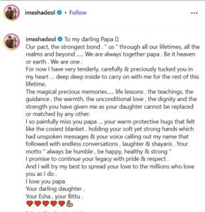 “आपका जीवन-मंत्र हमेशा विनम्र रहो, खुश रहो, स्वस्थ और मजबूत रहो। मैं वादा करती हूं कि मैं आपकी विरासत को गर्व और सम्मान के साथ आगे बढ़ाऊंगी। और मैं अपनी पूरी कोशिश करूंगी कि आपका प्यार उन लाखों लोगों तक पहुंचाऊं, जो आपको उतना ही चाहते हैं जितना मैं।I love you papa